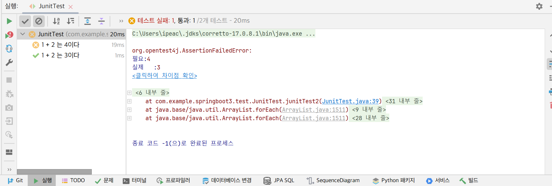 @DisplayName("1 + 2 는 4이다") @Test public void junitTest2() { int a = 1; int b = 2; int sum = 4; Assertions.assertEquals(sum, a + b); }