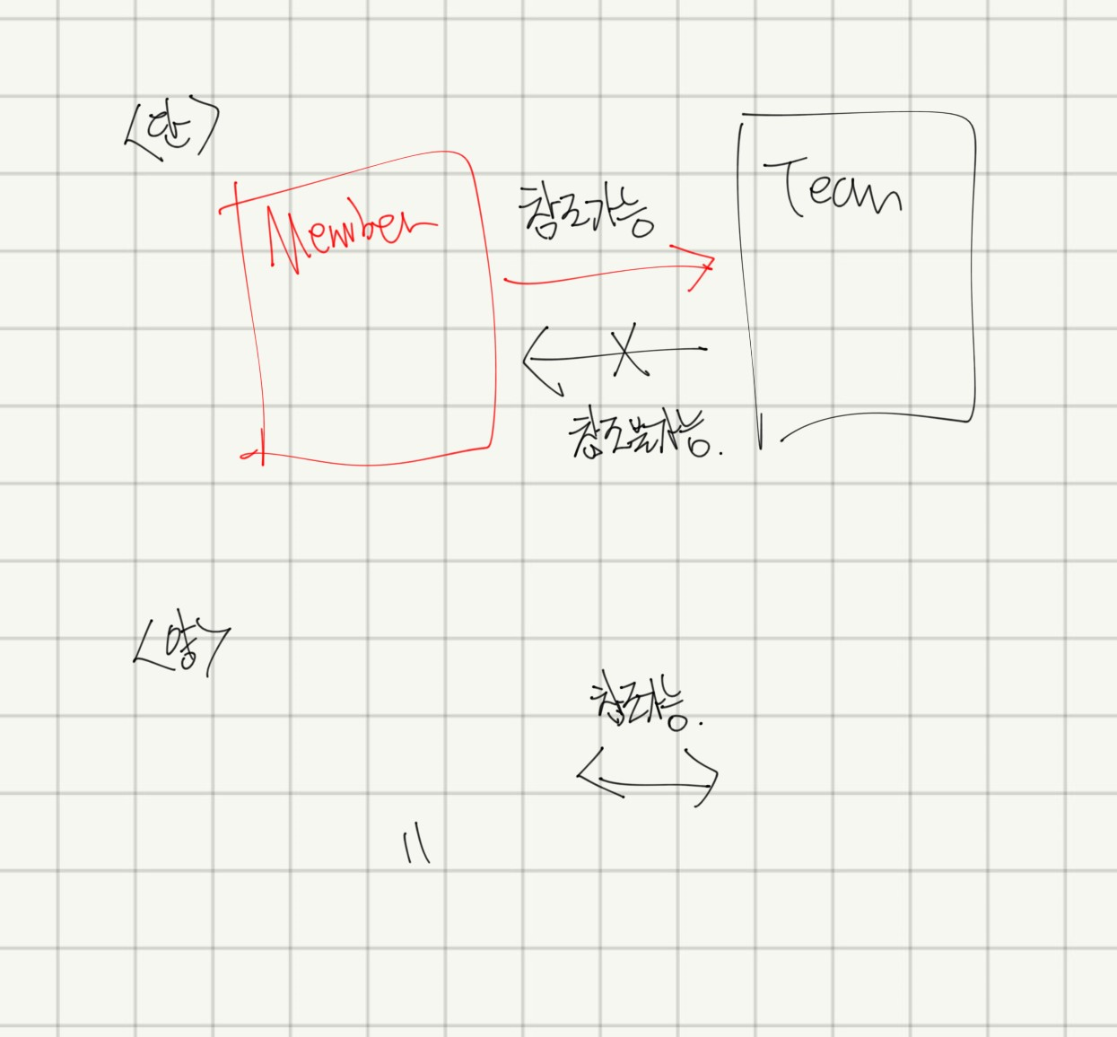 - 단방향 관계로서, 회원은 팀을 알 수 있으나, 팀은 회원을 알 수 없다.