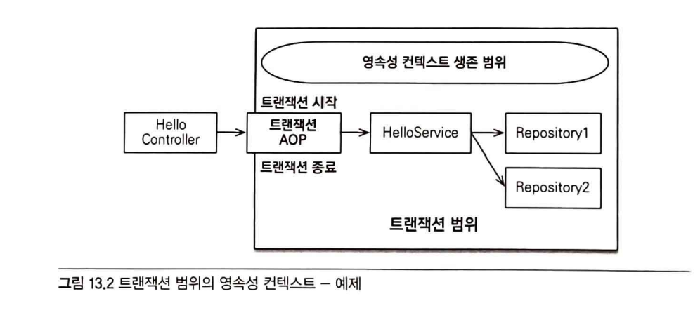 @Controller class HelloController { @Autowired HelloService helloService; public void hello() { // 반환된 member 엔티티는 준영속 상태다. Member member = helloService.logic(); } }@Service class HelloService { @PersistenceContext EntityManager em; @Autowired Repository1 repository1; @Autowired Repository2 repository2; // 트랜잭션 시작 @Transactional public Member logic() { repository1.hello(); Member member = repository2.findMember(); return member; // 트랜잭션 종료 } }@Repository class Repository1 { @PersistenceContext EntityManager em; public void hello() { // ... (엔티티 매니저를 사용한 데이터 접근) } }@Repository class Repository2 { @PersistenceContext EntityManager em; public Member findMember() { return em.find(Member.class, "id1"); // B. 엔티티 조회 } }@Transactional어노테이션을 통하여 스프링이 트랜잭션을 관리