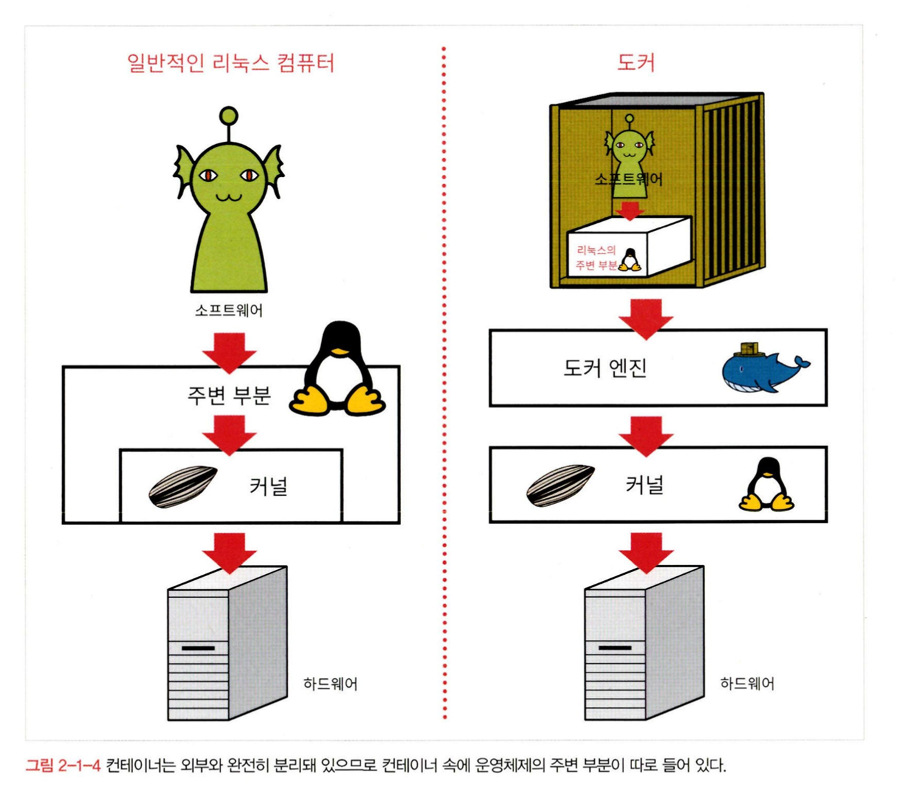 주변 부분이 있어서,- 컨테이너 안에서 실행되는 프로그램들이 필요한 명령어를 주고 받는다.
