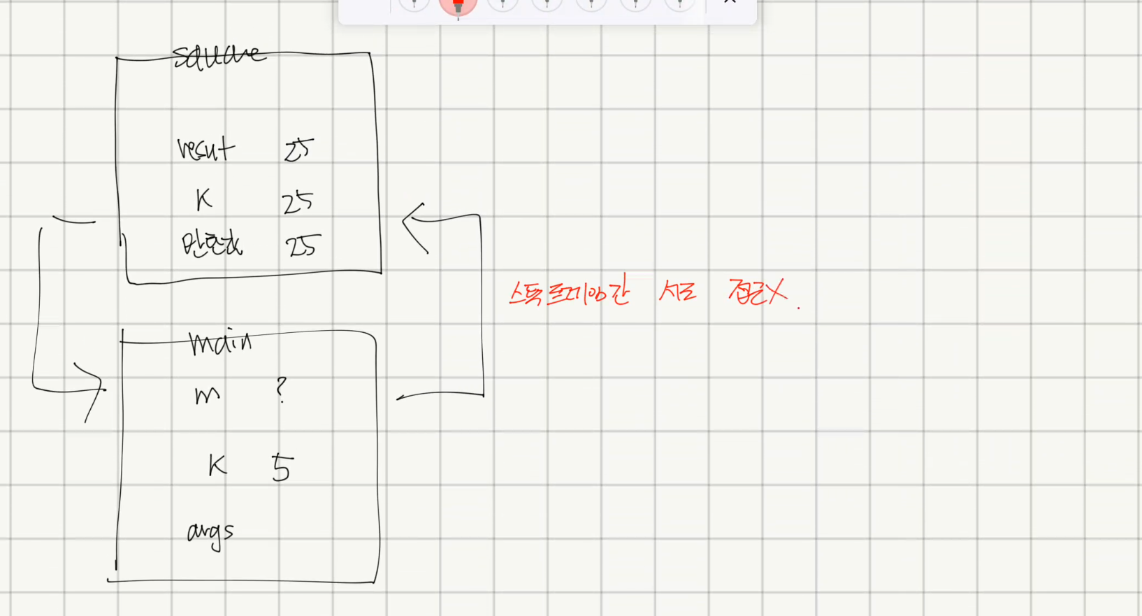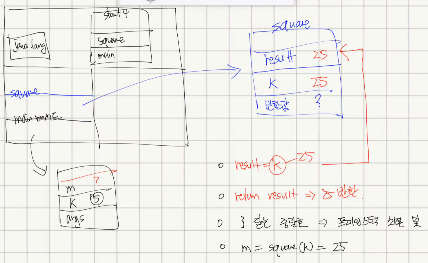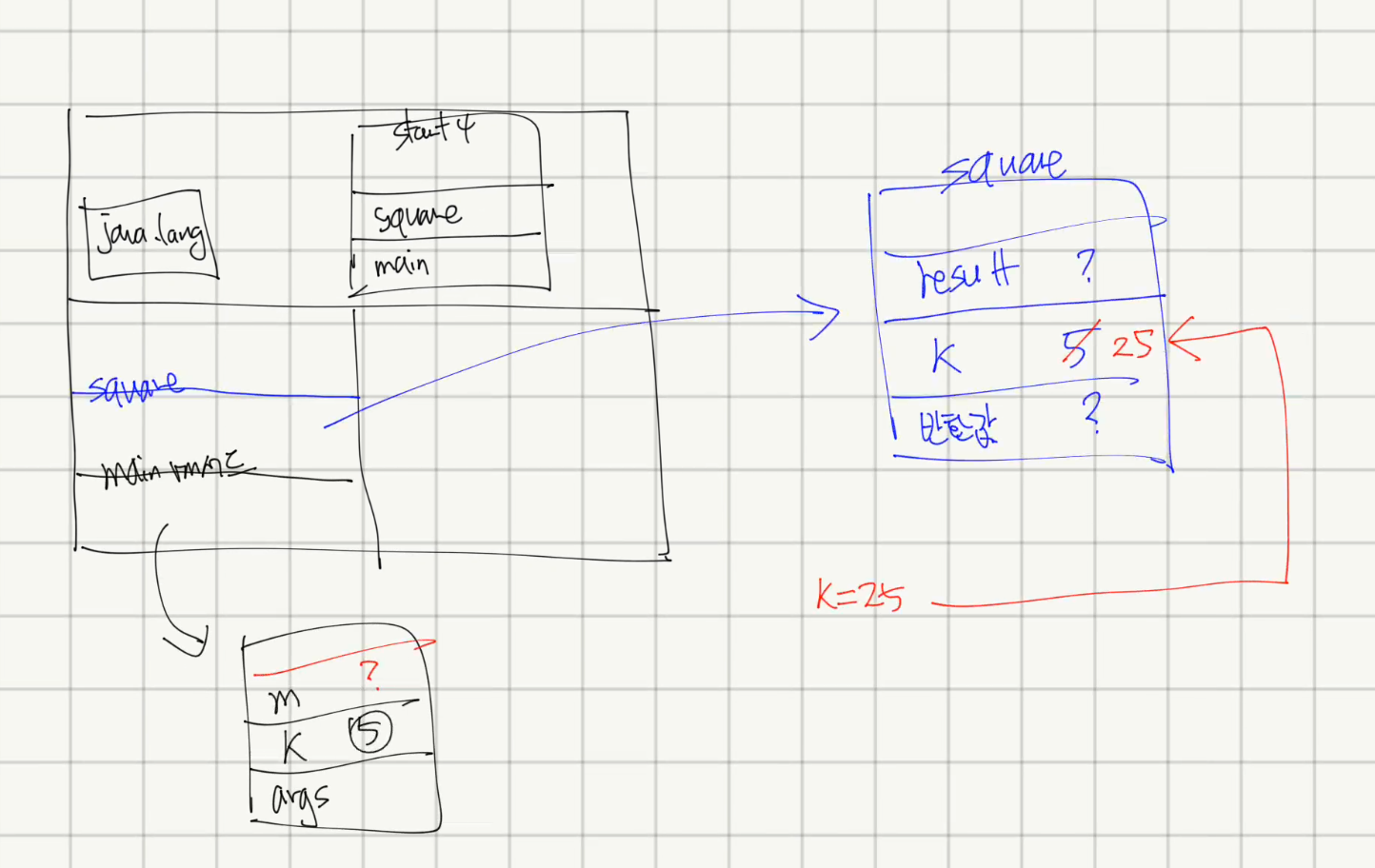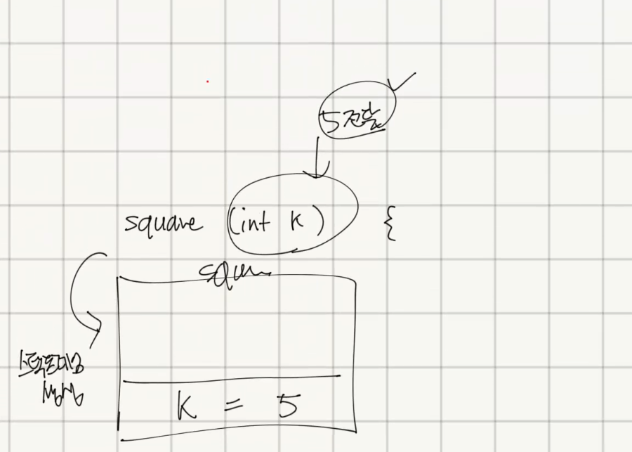 - square 와 main 메서드 내부의 지역변수 m 에 서로 접근하는 경우, 메모리 상의 주소를 명확하게 알고 있어야한다. 즉 , 포인터 문제가 발생한다
