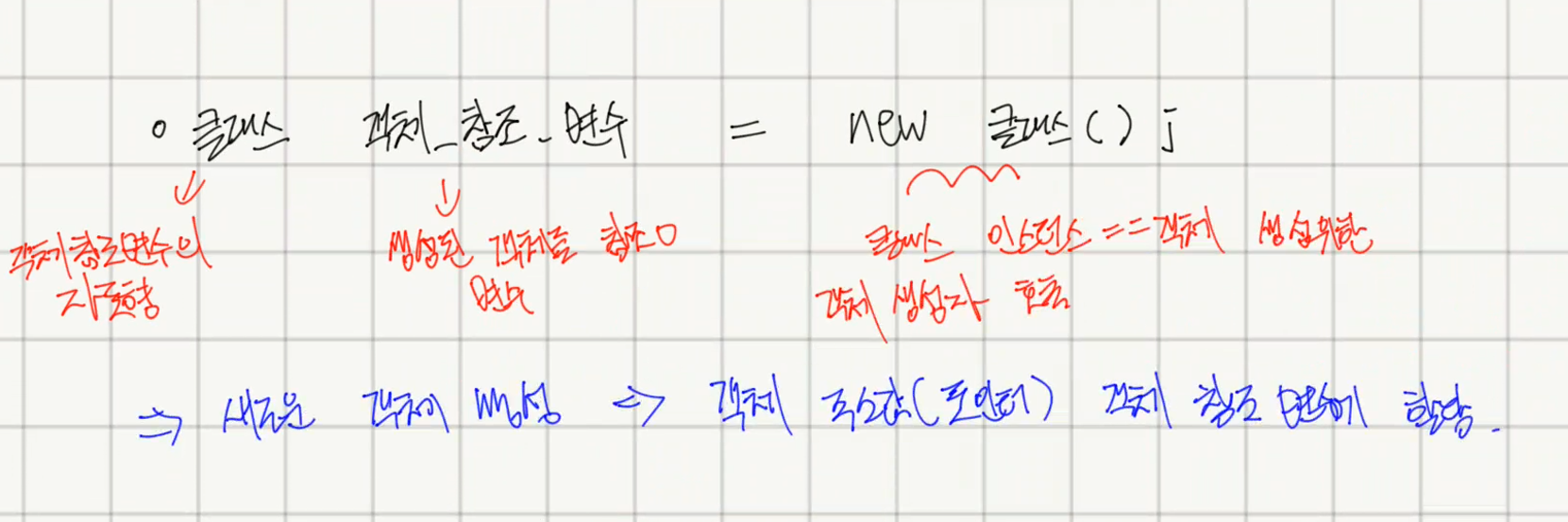 - 클래스는 객체의 설계도이자, 객체는 그 설계도를 바탕으로 실체화된 개별 사물이나 대상