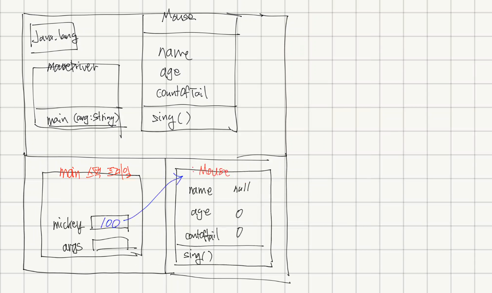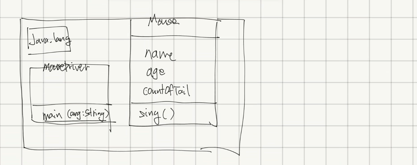 public class MouseDriver { public static void main(String[] args) { Mouse mickey = new Mouse(); mickey.name = "미키"; mickey.age = 85; mickey.countOfTail = 1;