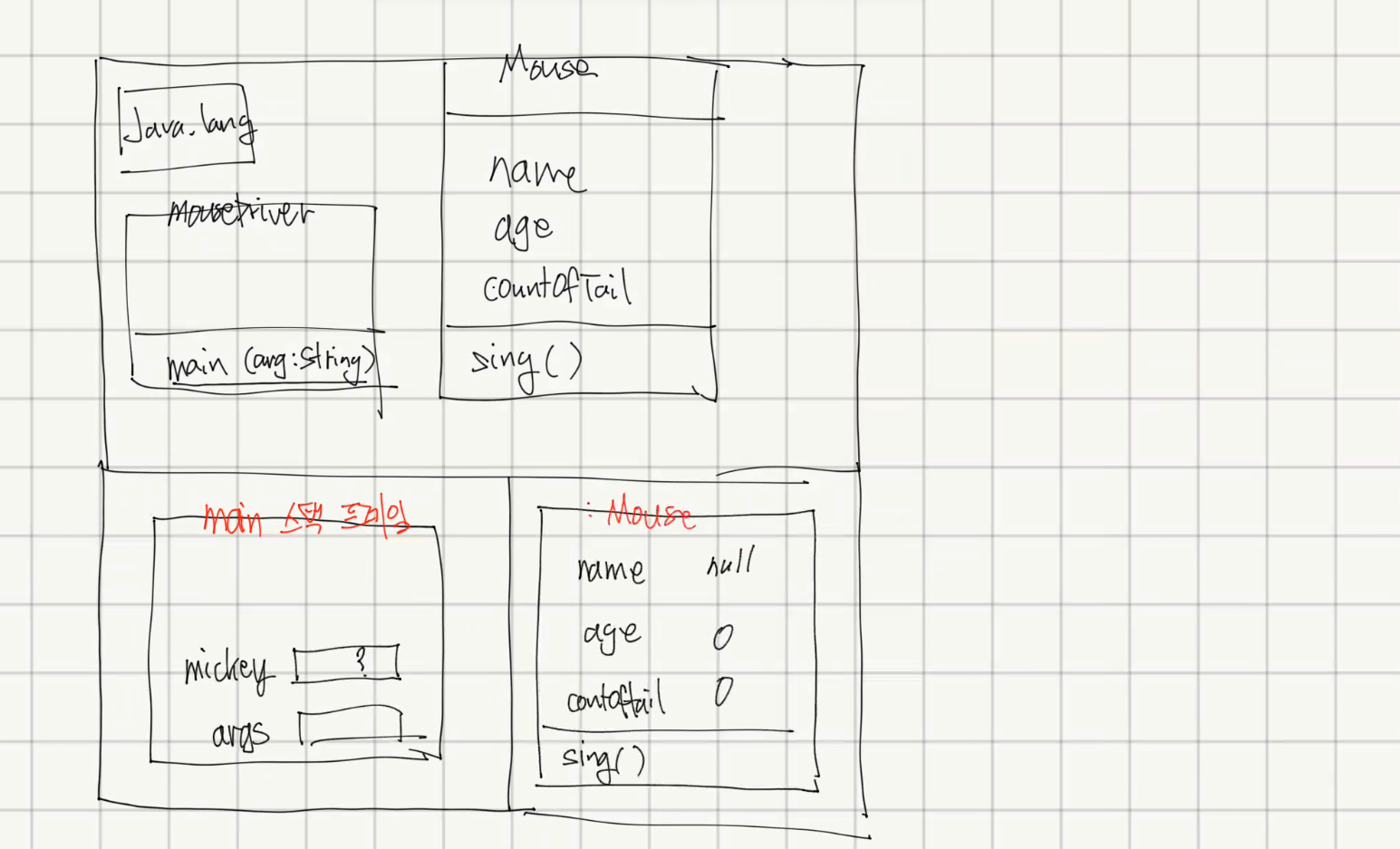mickey.sing()- main 스택 프레임에 sing() 메서드의 메서드 스택이 쌓인다.